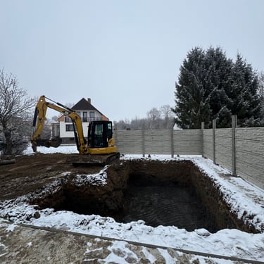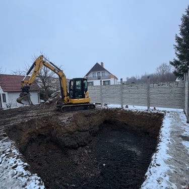 Výkopy pro rodinné domy, základové desky, bazény i inženýrské sítě s důrazem na přesnost.